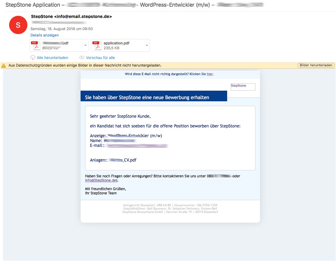 Dies steigert nicht nur den Aufwand beim Ausschreibenden, es stört auch dessen Prozesse für Ausschreibungen und es passiert sehr leicht, daß diese Mails von Portalen als Spam gewertet und gleich weggeworfen werden. Wenn man ein Jobportal nutzt, dann bitte nutzt keine Default-Templates von dort und auch nicht dessen Kontaktservice, sondern schreibt trotzdem selbst.