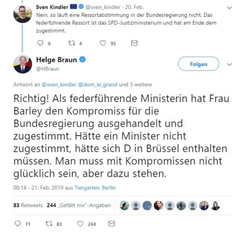 Wie auch immer: Frau Barley und damit die SPD wertete die Prioritäten offenbar anders. 4,7 Millionen Unterschriften, die Stellungsnahmen vieler namhafter Experten, etc pp. ließen sie zwar lächeln, am Ende stimmte sie dennoch dafür, die Artikel 11 und 13 beizubehalten.