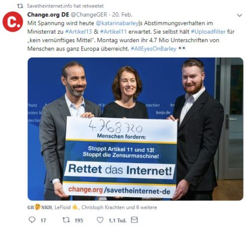 Wenige Stunden vor ihrer Zustimmung musste Frau Barley die erfolgreichste Unterschriftenaktion von Change.org zur Kenntnis nehmen. Über 4,7 Millionen Menschen haben sich gegen die in Artikel 13 beschrieben Methoden, bzw. deren Folgen ausgesprochen.