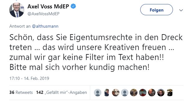 Maximal töricht war es da von Herrn Alexander Voss, als er Menschen die seine Meinung nicht teilten, aufforderte, die Texte zum Artikel 11 und 13 durchzulesen.