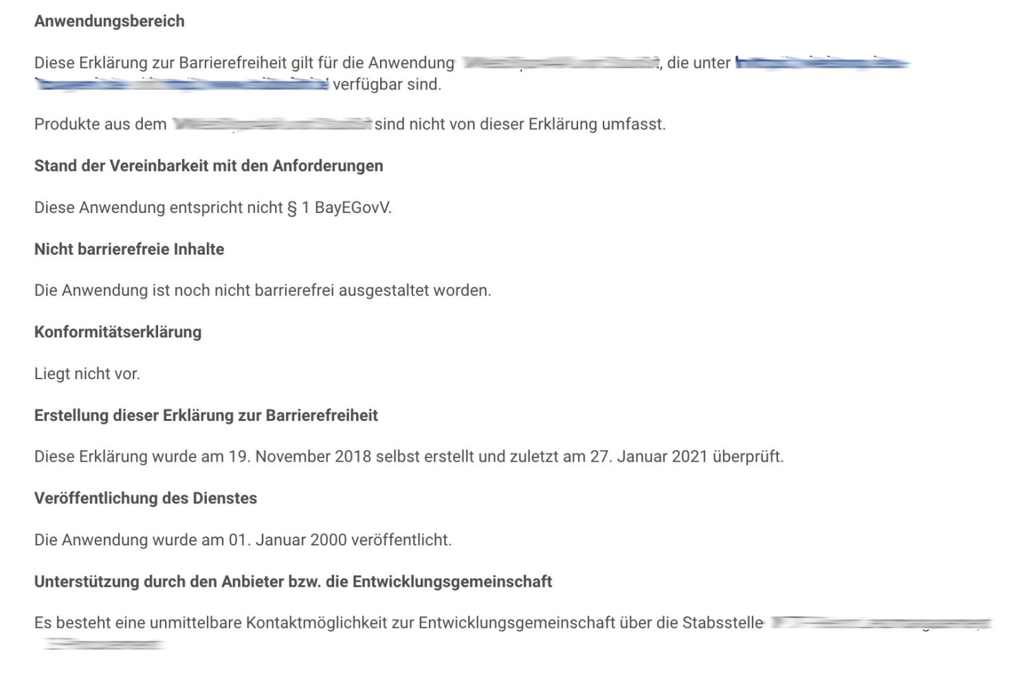 Es fehlt an jeglicher Erklärung zu dem Grund für die Mängel und warum sie nicht beseitigt werden konnten. Es wird weder eine Prognose zur Behebung angegeben, noch ein alternativer Zugangsweg. Die angegebene Kontaktmöglichkeit verweist an einen Intermediär, nämlich an eine Stabsstelle. (Und dies auch noch ohne Angaben zur Kontaktaufnahme: Keine Adressdaten, Mailadressen oder Telefonnummer).