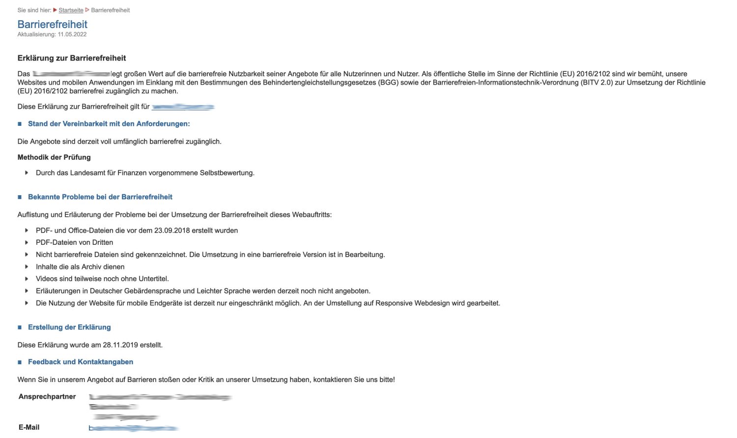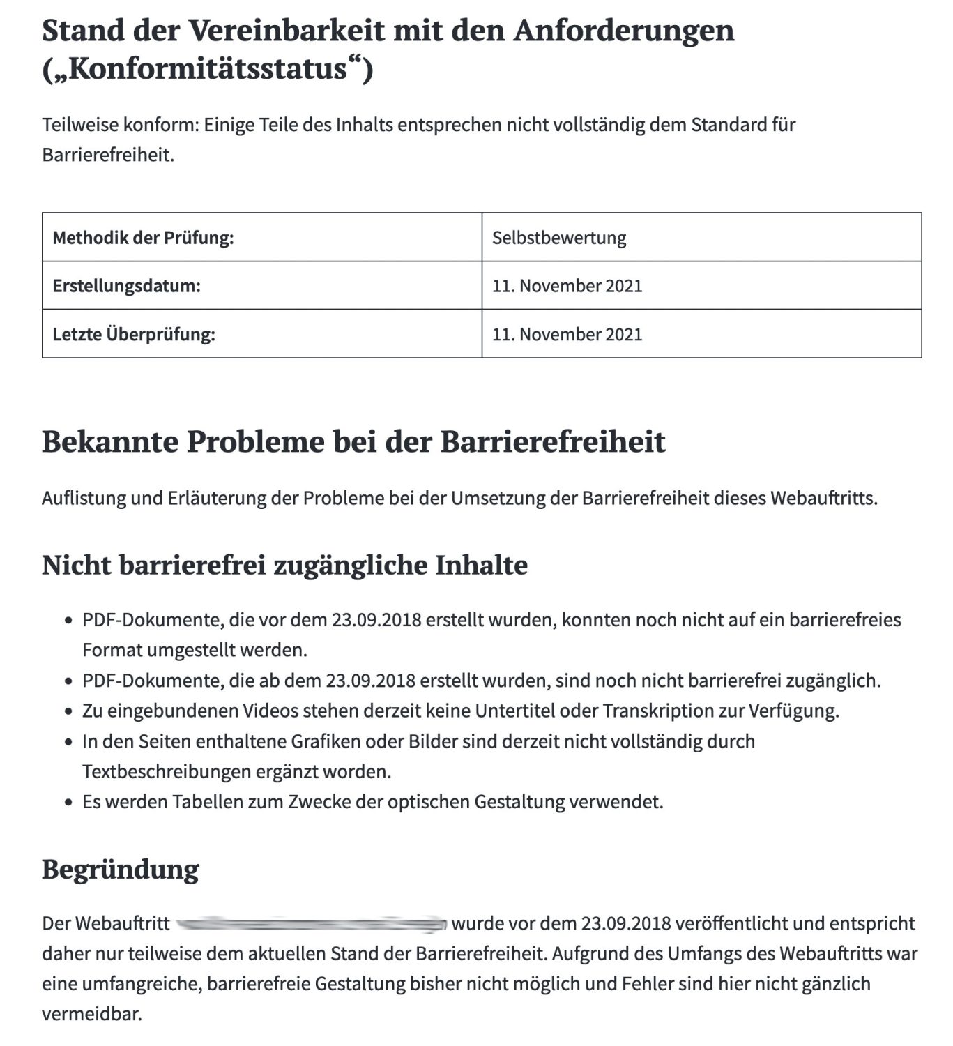 Der Webauftritt … wurde vor dem 23.09.2018 veröffentlicht und entspricht daher nur teilweise dem aktuellen Stand der Barrierefreiheit. Aufgrund des Umfangs des Webauftritts war eine umfangreiche, barrierefreie Gestaltung bisher nicht möglich und Fehler sind hier nicht gänzlich vermeidbar.