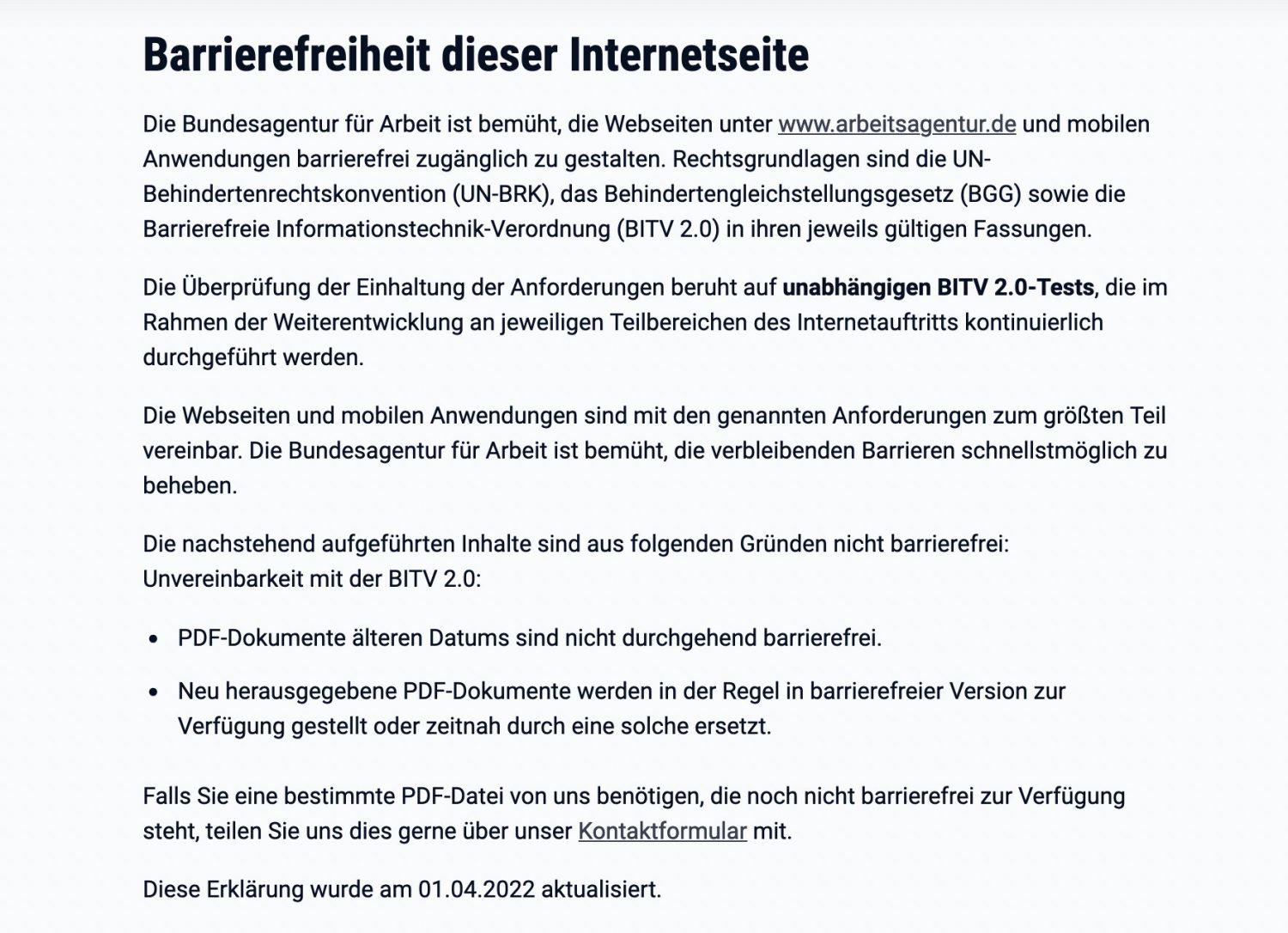 Die zentrale Website der Bundesverwaltung listet auf ihrer Barrierefreiheitserklärung ebenfalls transparent und konkret die Mängel auf.